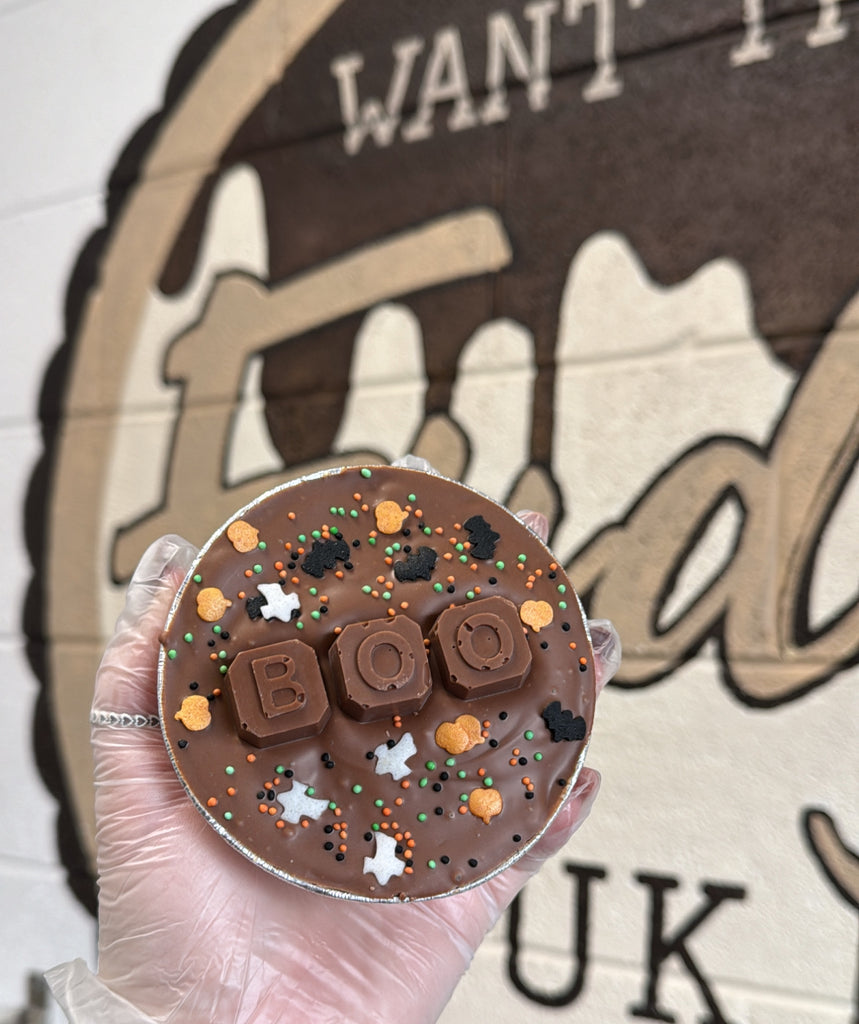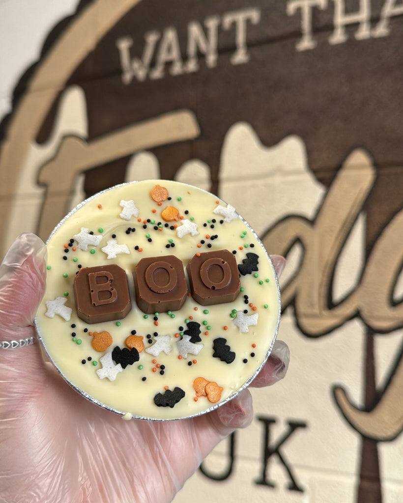 Vanilla fudge “pie” base, with milk chocolate chips, buttery caramel in the middle. Topped with your choice of chocolate, “boo” and sprinkles.